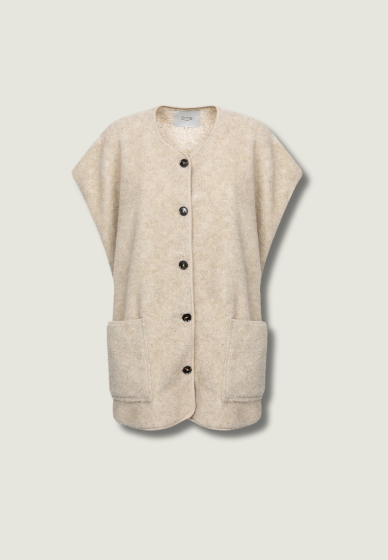 De Ines teddy is een variant op het Hannah vest, maar dan zonder mouwen. Een oversized pasvorm met knoopsluiting en zakken.