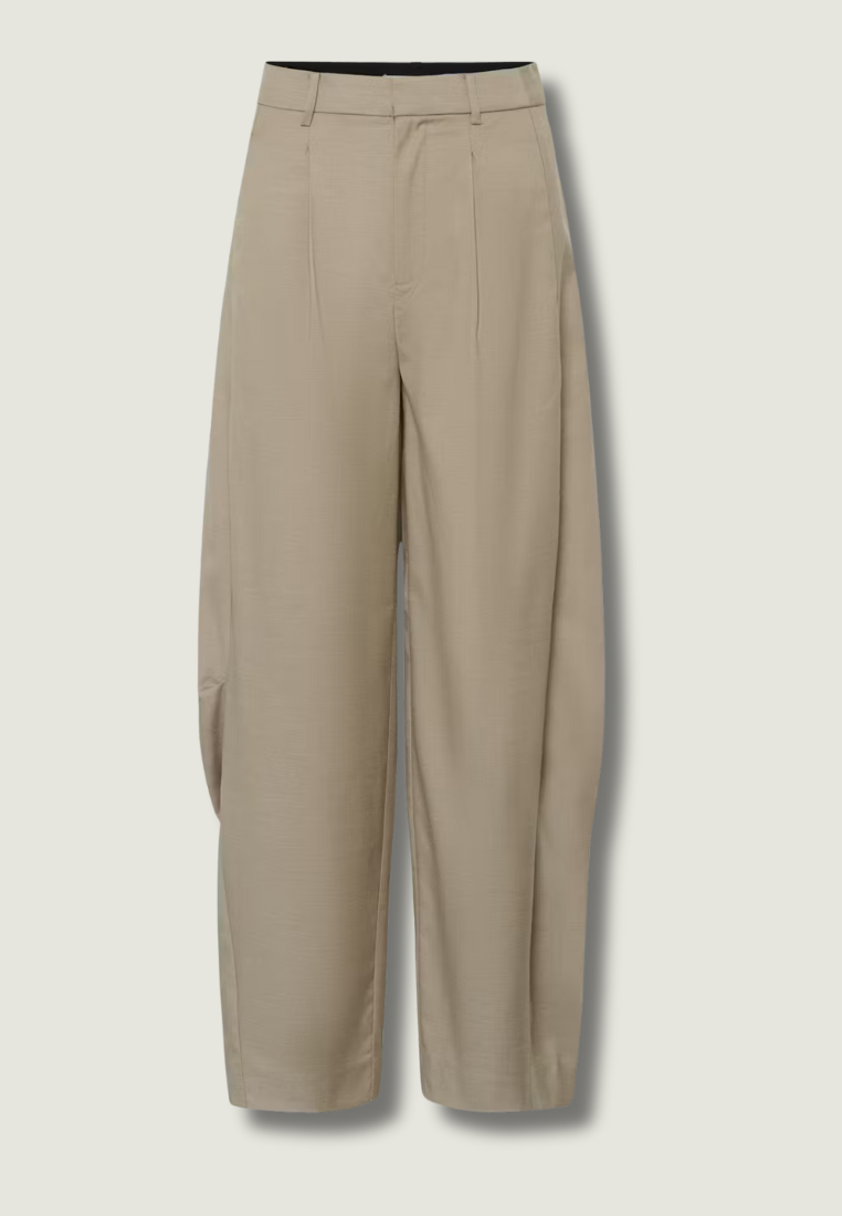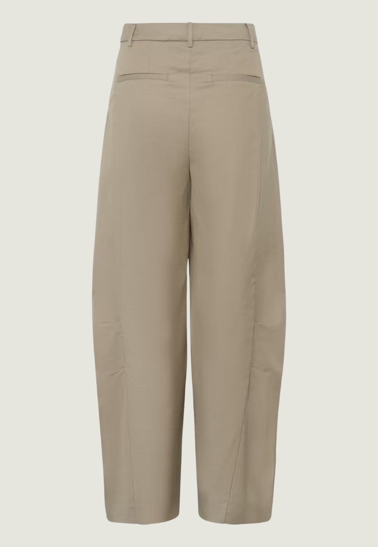 Deze pantalon heeft wijde pijpen en een hoge taille met verstelbaar elastiek.