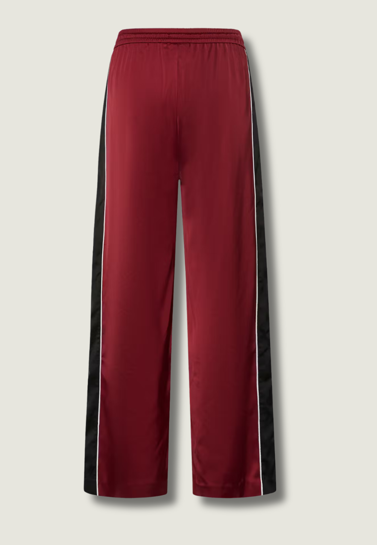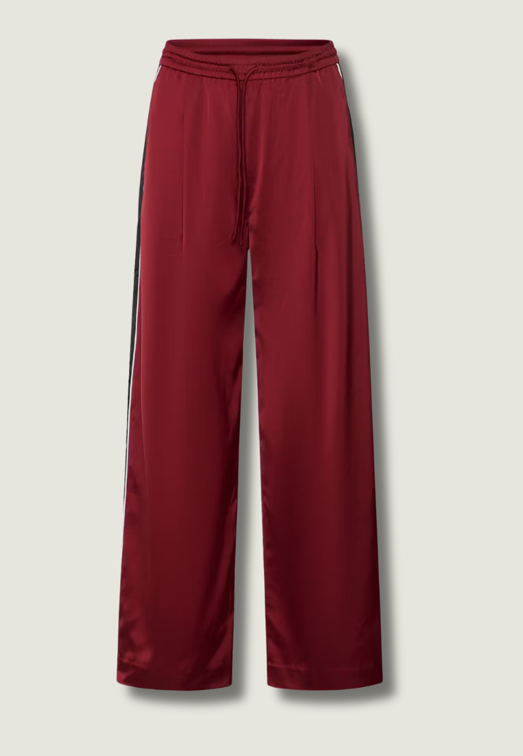 Comfortabele, wijde broek met een elastische tailleband en trekkoord. Satijnachtige stof en een zijstreep geven een sportieve look, de volledige lengte zorgt voor een moderne uitstraling.