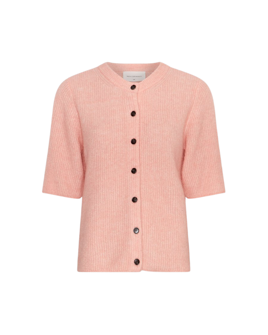 Gebreid vest met ronde hals en doorlopende knoopsluiting. Ontworpen met korte mouwen en een licht gestructureerde gebreide stof met ribboorden.