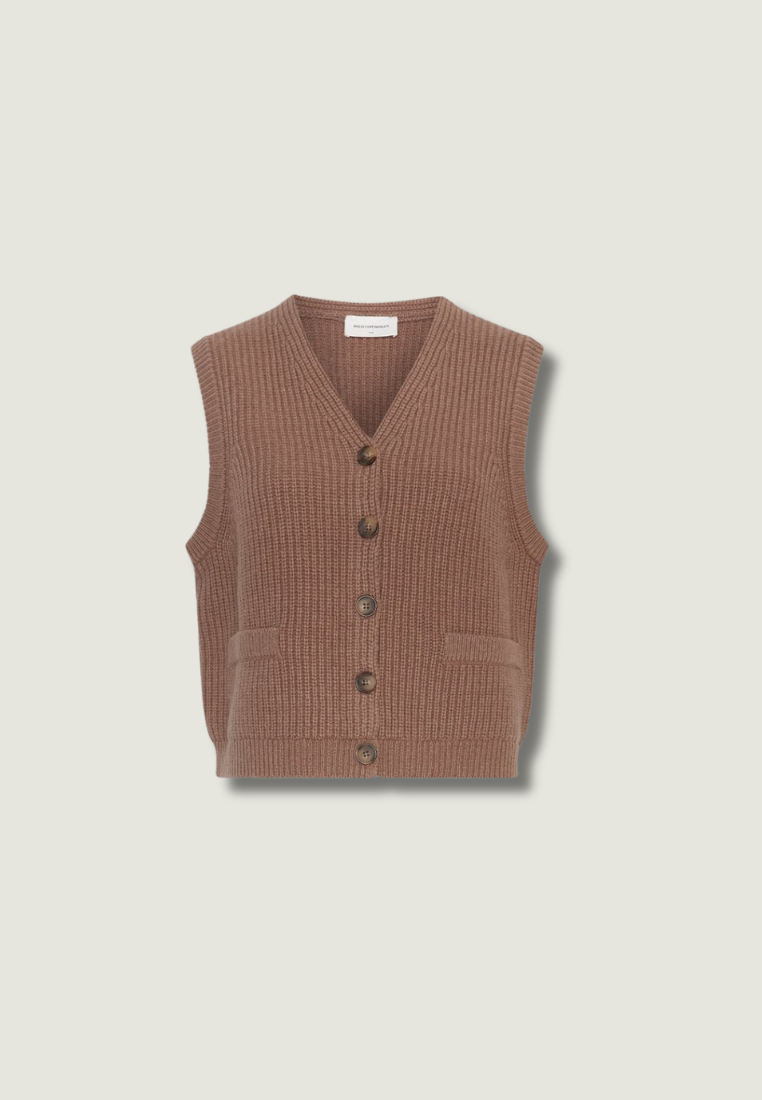 Dit gebreide vest heeft een V-hals, knoopsluiting aan de voorkant en subtiele zakken.